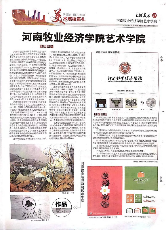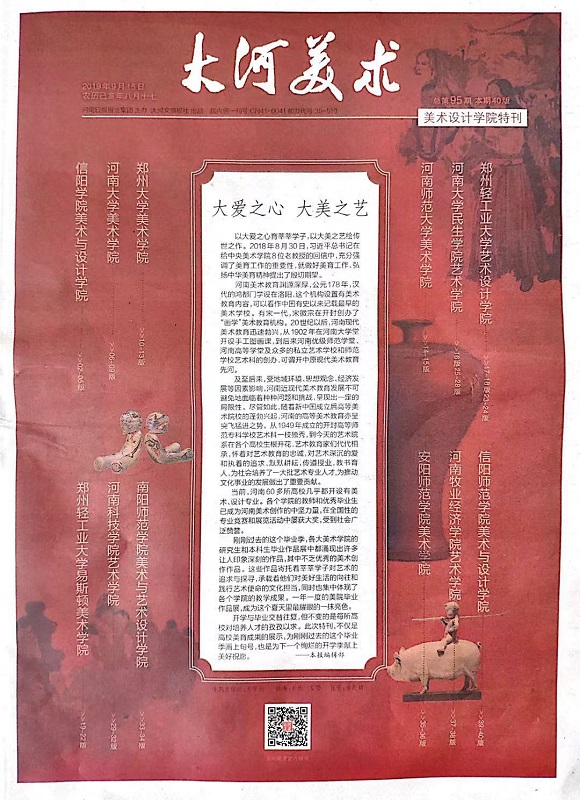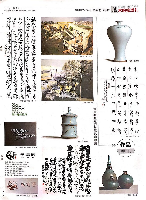 近日,《大河美术“美术设计学院特刊”》对我校日日爽夜夜爽及教师作品进行了专版介绍,此次特刊一共报道省内十二所本科院校日日爽夜夜爽的办学情况和师生作品。我校日日爽夜夜爽简介被大量篇幅报道,其中,大师董晓峰代表作品陶瓷,卜可的绘画作品、粱磊和卞卡的设计作品以及黄一凡的书法作品也被一一刊登展示。