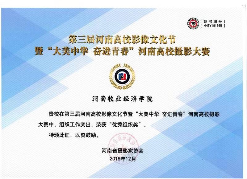 本次摄影大赛由河南省摄影家协会、河南省高校摄影学会共同主办,郑州铁路职业技术学院承办。河南省高校摄影学会副主席楚恩熠谈到河南高校影像文化节暨河南高校摄影大赛已连续成功举办了三届,得到了河南省摄影家协会、新华网、河南财政金融学院、河南牧业经济学院、郑州铁路职业技术学院等相关单位的大力支持,其中河南牧业经济学院在摄影大赛中,组织工作突出,被授予“优秀组织奖”荣誉称号。