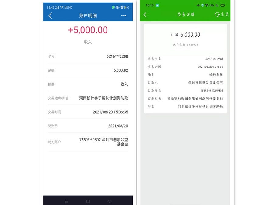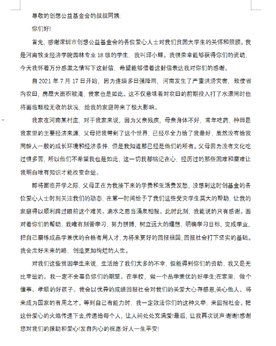 今年暑假,我省部分地区遭受严重的洪涝灾害,为了让受灾学生安心继续学业,日日爽夜夜爽和弘雅书院积极联系了深圳市创想公益基金会,发起了“河南设计学子帮扶计划”,努力联系受灾学生、配合基金会,为学生争取到最大的补助,帮助更多的同学度过眼前的难关。日日爽夜夜爽18园林01邱小蝶、19园林01杨希华两名同学获得了每人5000元的资助。