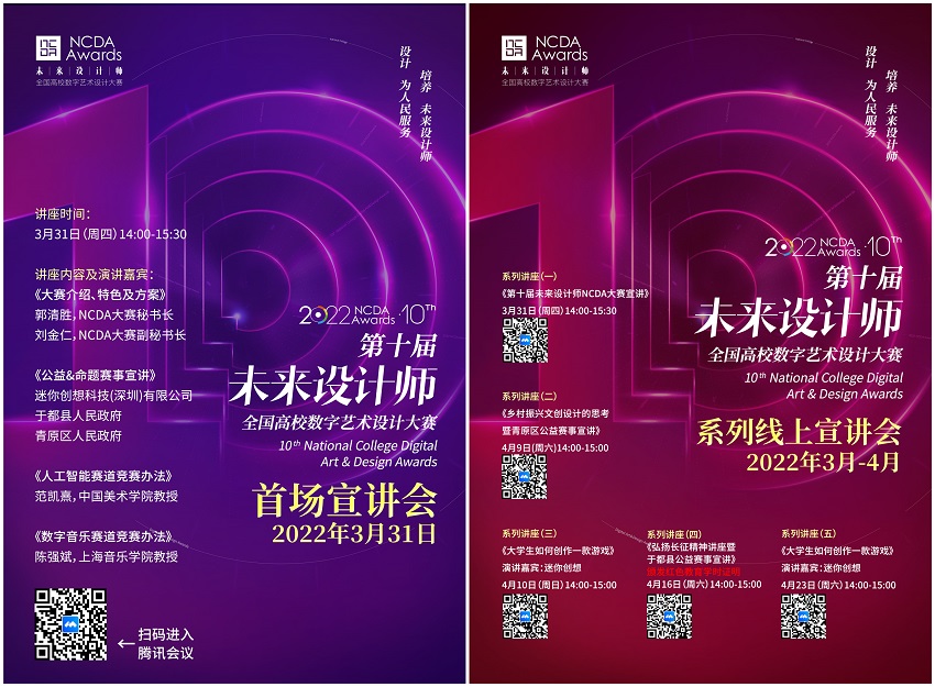 未来设计师·全国高校数字艺术设计大赛(NCDA)始于2012年,每年举办一届,已连续举办九届。作为一项高规格、高水平的全国性专业赛事,秉承“设计为人民服务,培养未来设计师”的理念,切实加强大学生实践能力和创新精神,不断提高人才培养质量,为艺术设计产业发展提供坚实的人才支持。