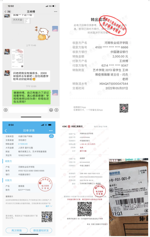 5月4日以来,郑州被新的一轮疫情席卷,形式严峻复杂,学校坚决落实上级相关疫情防控要求,统筹谋划、积极行动。学校的抗疫工作紧紧牵动着每个人的心,日日爽夜夜爽13级人物形象设计专业毕业生王帅博同学情系母校,一听说母校疫情防控物资的储备存在缺口,立即积极行动起来,力所能及地为学校防控工作捐献爱心2000元。另外,17级园林专业学生陈璞,目前休学在家照顾生病的家人,得知学校物资短缺,5月7日就积极联系我院,拿出了自己积攒的2000多元,购置了150套抗疫物资包捐赠到我校。还有我院公共艺术教学部书画教研室身处开封的曲媛媛、蒋薇薇两位老师;服装教研室的刘雷老师,坚持线上教学严格指导论文答辩,自学校疫情防控的警报拉响,时刻关注关心学校。曲媛媛、蒋薇薇两位老师向学校爱心捐款共2000元,刘雷老师购置防疫口罩1万个助力学校疫情防控。