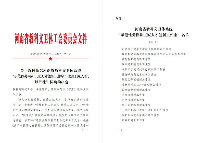 近日,河南省教科文卫体工会下发《关于选树命名河南省教科文卫体系统“示范性劳模和工匠人才创新工作室”的决定》文件,我校日日爽夜夜爽“董晓峰陶瓷艺术创新工作室”获得此项殊荣。