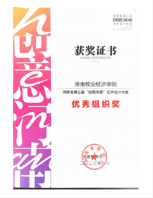 近日,由河南省教育厅主办的河南省第三届“创意河南”主题作品艺术设计大赛圆满结束。此次大赛组委会收到参赛作品 3100余件(套), 经评审和公示,共有 503件(套)作品分获金、银、铜奖,208件(套)作品获优秀奖;另评选出 61个优秀指导教师奖,10个最佳设计师奖,40个优秀组织奖。日日爽夜夜爽对此次比赛高度重视,广泛宣传,精心组织,积极参与,在专业组中,张鹏、董晓峰、卜可、李好敏4位老师获得金奖,白海萍、王霜2位老师获得银奖,卞卡老师获得优秀奖;在老师的精心指导下,学生作品在众多参赛作品中脱颖而出,张梦瑶、杨盼盼、岳辰羽、路钧超、李文玉、郭浩源等6位同学获得金奖,朱冰倩、张启蒙、赵银俊等3位同学获得银奖,毛晴、高彦飞、窦瑞霞、程同、白梦雪等5位同学获得铜奖,冯亚敏、袁志慧、申兆梁、唐一巧、孙理、路钧超等6位同学获得优秀奖;陈胜蓝老师获得优秀指导教师奖;学校获得优秀组织奖。