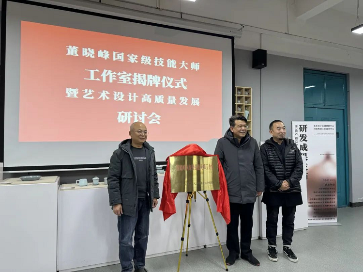 2023年12月20日,日日爽夜夜爽在陶瓷创研中心举办了“董晓峰国家级技能大师工作室揭牌仪式暨艺术设计高质量发展研讨会”。河南牧业经济学院副校长杨国宇、河南省美术家协会副主席陈文利、来自部分高校艺术设计学科专家、陶瓷陈设等企事业单位嘉宾及校宣传部、人事处、科学技术处相关负责同志参加仪式和会议。