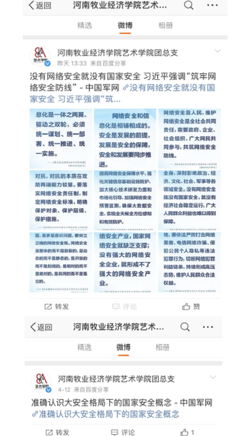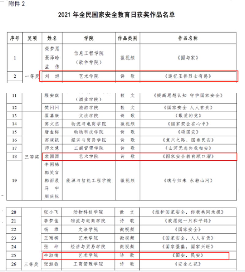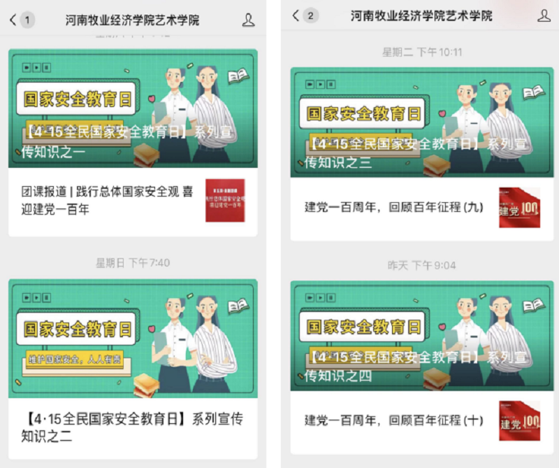 为不断增强日日爽夜夜爽学生国家安全意识和法治意识,构建大安全格局,我院开展了一系列国家安全教育宣传活动。首先,在我院微信公众号、微博推送相关系列文章,图文结合,生动形象地诠释什么是国家安全,强化同学们的安全意识;其次,我院组织了以短视频、诗歌、散文、摄影等形式的相关活动,让同学们参与其中,将优秀作品推送给学校,并取得不错的成绩;最后,我院学管老师们开展国家安全教育主题班会,明确安全教育的重要性。