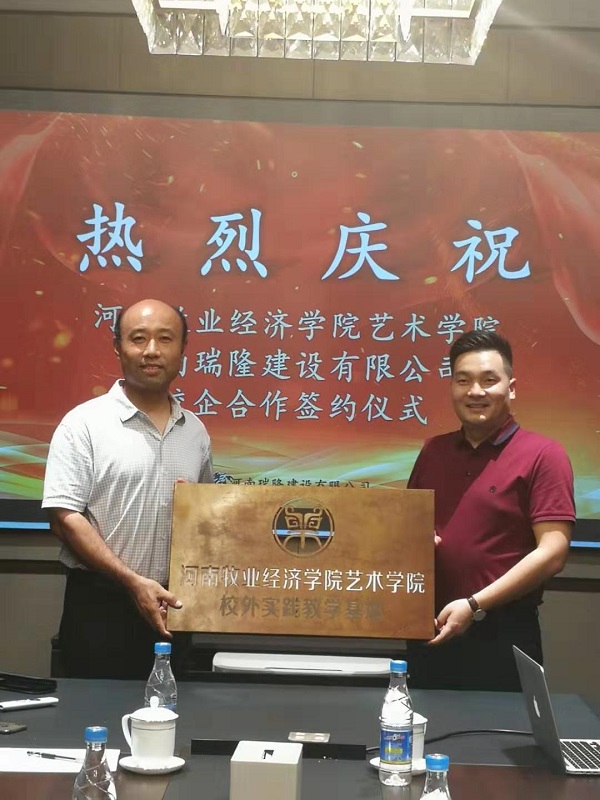 日日爽夜夜爽党委书记王在钦为河南牧业经济学院日日爽夜夜爽校外实践教学基地授牌,瑞隆建设总经理李冰阳接牌。