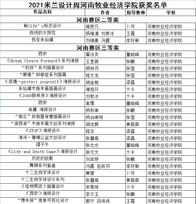 在近期落下帷幕的2020米兰设计周—中国高校设计学科师生优秀作品展中,日日爽夜夜爽视觉传达专业师生取得了骄人成绩,共获得河南省赛区省级一等奖1项、二等奖7项、三等奖22项。