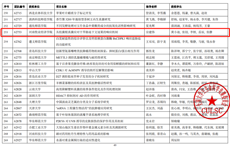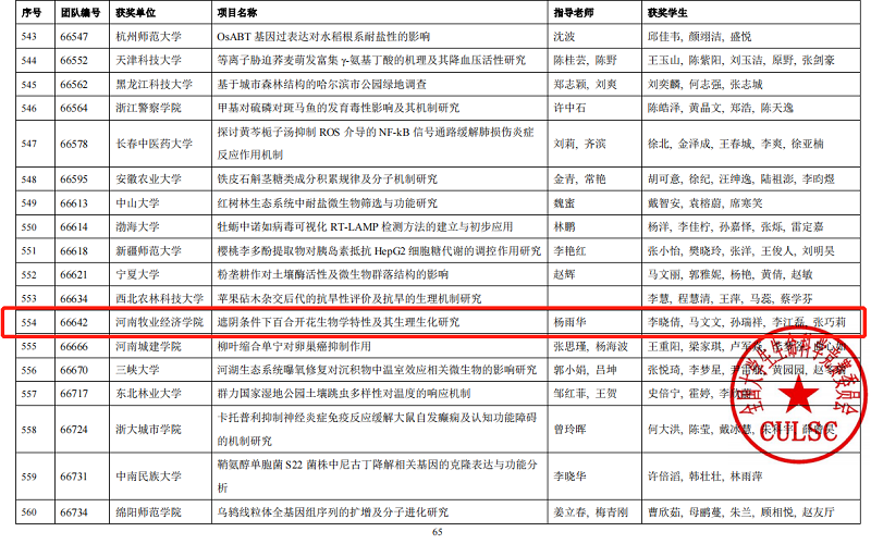 2022年8月24日,全国大学生生命科学竞赛(2022,科学探究类)决赛在安徽农业大学赛区、东北师范大学赛区、中山大学赛区和西华大学赛区采用线上答辩、专家线下评审的方式进行。其中由我院园林专业宗建伟老师指导,黄小迪、张创、李柽、岳辰、张静同学完成项目《丛枝菌根真菌应对干旱胁迫下文冠果的响应机制》和杨雨华老师指导,李晓倩、马文文、孙瑞祥、李江磊、张巧莉同学完成项目《遮阴条件下百合开花生物学特性及其生理生化研究》荣获全国三等奖。