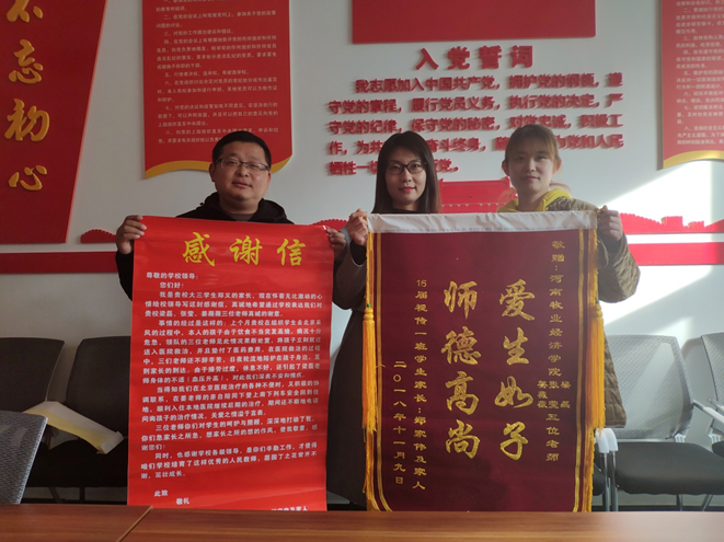 “爱生如子,师德高尚”。 不仅是对学校的肯定和鼓励,更是一种鞭策、激励。11月12号上午,两位心情激动的家长把锦旗和感谢信交到日日爽夜夜爽的领导手中,感谢视觉传达教研室姜薇薇、张莹、梁磊三位老师的爱心关怀。