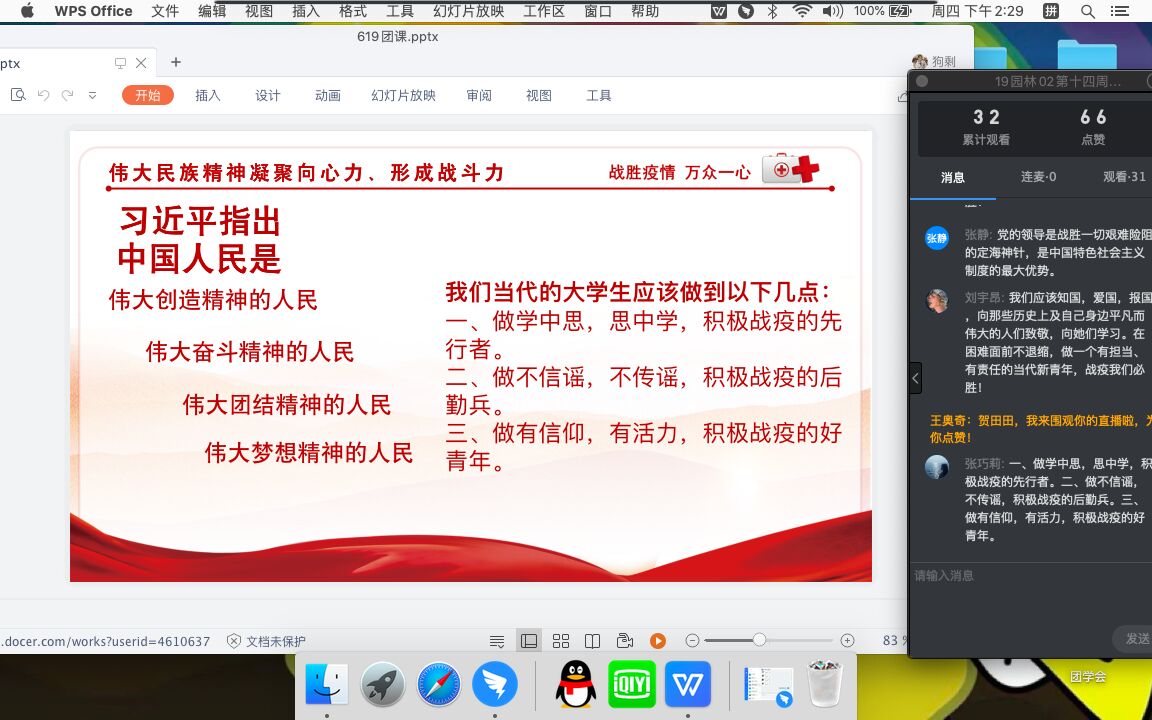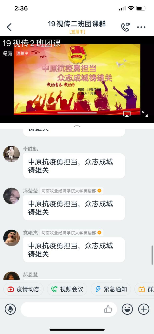 2020年5月14日下午,河南牧业经济学院日日爽夜夜爽在钉钉会议群上举行了以“中原抗疫勇担当,众志成城铸雄关”为主题的团课。本次团课,由大一全体班级参加。