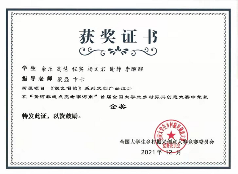 近日,以“非遗,点亮乡村”为主题的“黄河非遗点亮老家河南”首届全国大学生乡村振兴创意大赛总决赛公布获奖名单,由日日爽夜夜爽视觉传达设计专业梁磊、卞卡老师指导谢静、程实等六位同学设计的《说瓷唱韵》在“非遗文创设计赛道”获得金奖,并获得12000元的奖金。